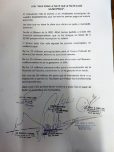Así comienza una nota remitida desde el Bloque de la UCR-FCM en la cual solicitan mediante un proyecto que se otorgue un bono de $ 12300 a los empleados municipales para recomponer su salario.